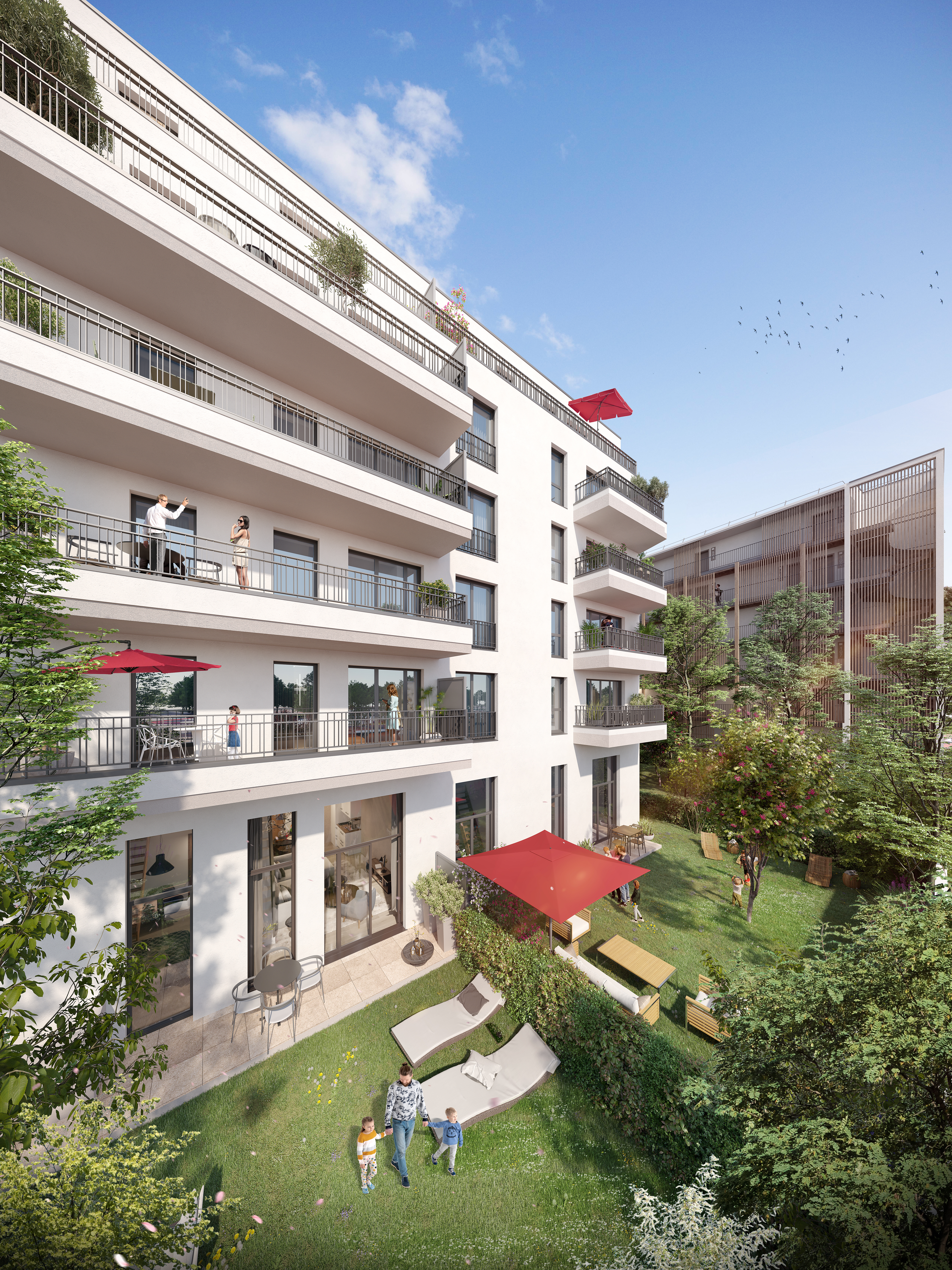 Un grand porche majestueux offre une percée visuelle sur le cœur d’îlot arboré. À l’intérieur, la nature reprend ses droits et instaure un dialogue harmonieux entre le végétal et le minéral. La réalisation se transforme, les ouvertures se font plus généreuses et les balcons s’ouvrent sur des espaces paysagers apaisants. Au rez-de-chaussée, les jardins privatifs sont protégés des regards extérieurs par des haies vives. Tandis que des venelles piétonnes permettent de se promener au cœur de cette trame végétale et de rejoindre le second hall d’entrée.
