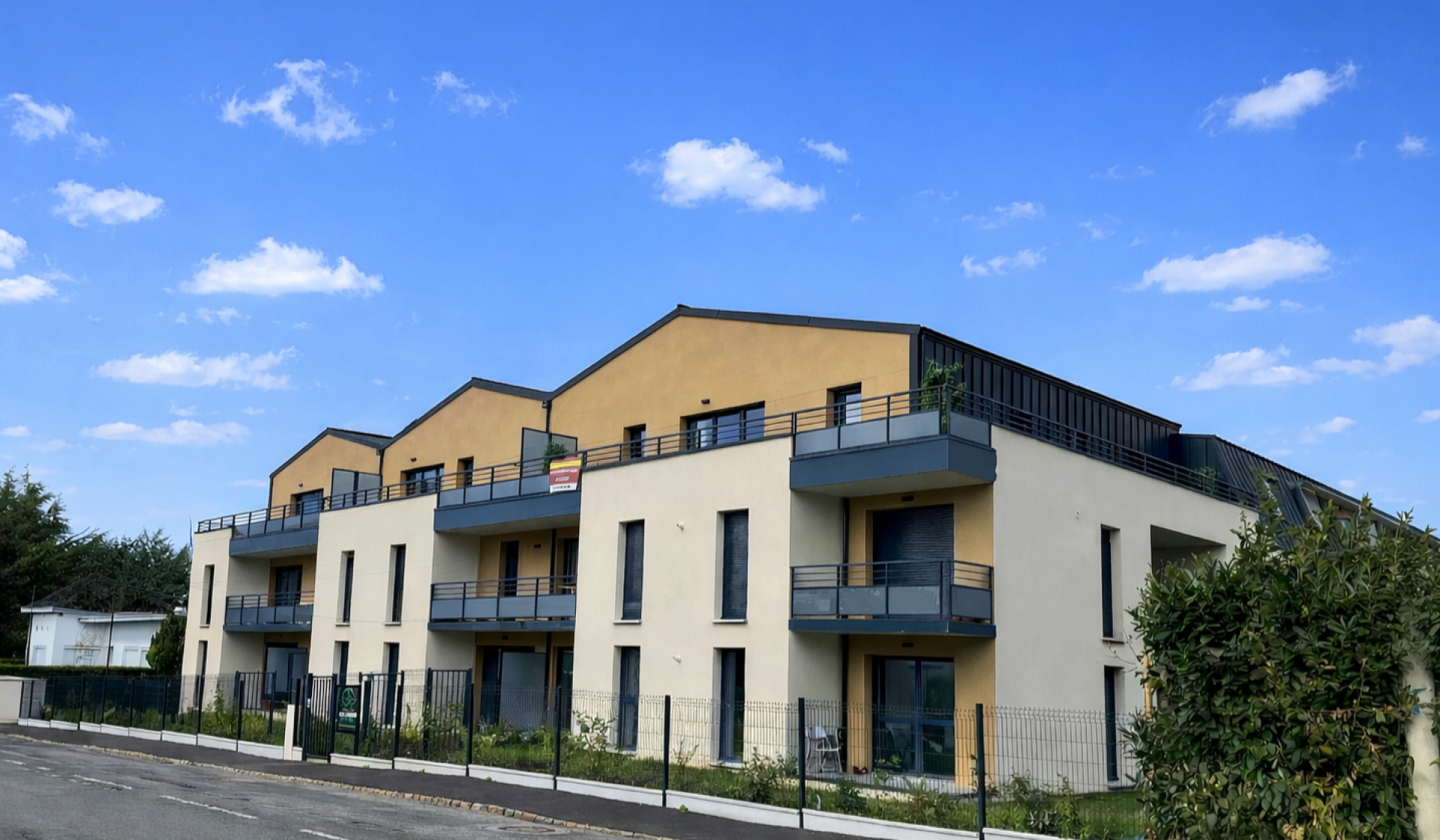 Le long d'une jolie rue bordée de maisons, Les Jardins du Vallon dévoilent une écriture sobre aux lignes épurées harmonieusement intégrée dans son environnement de qualité.